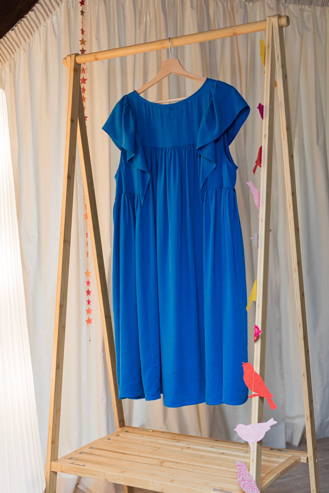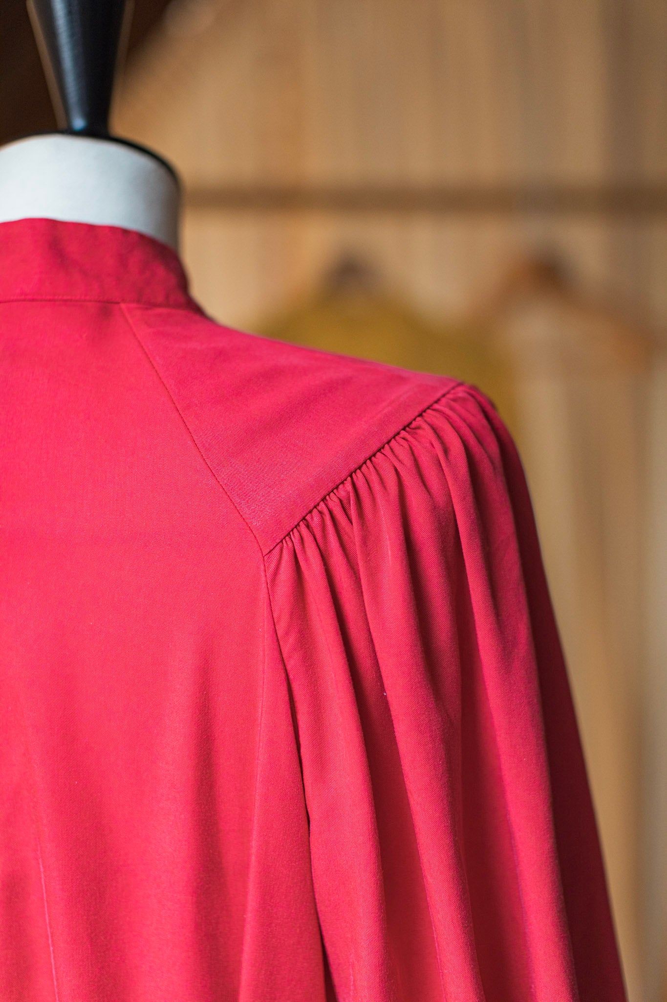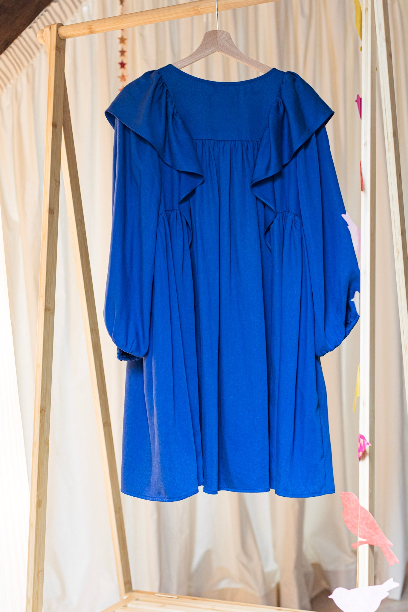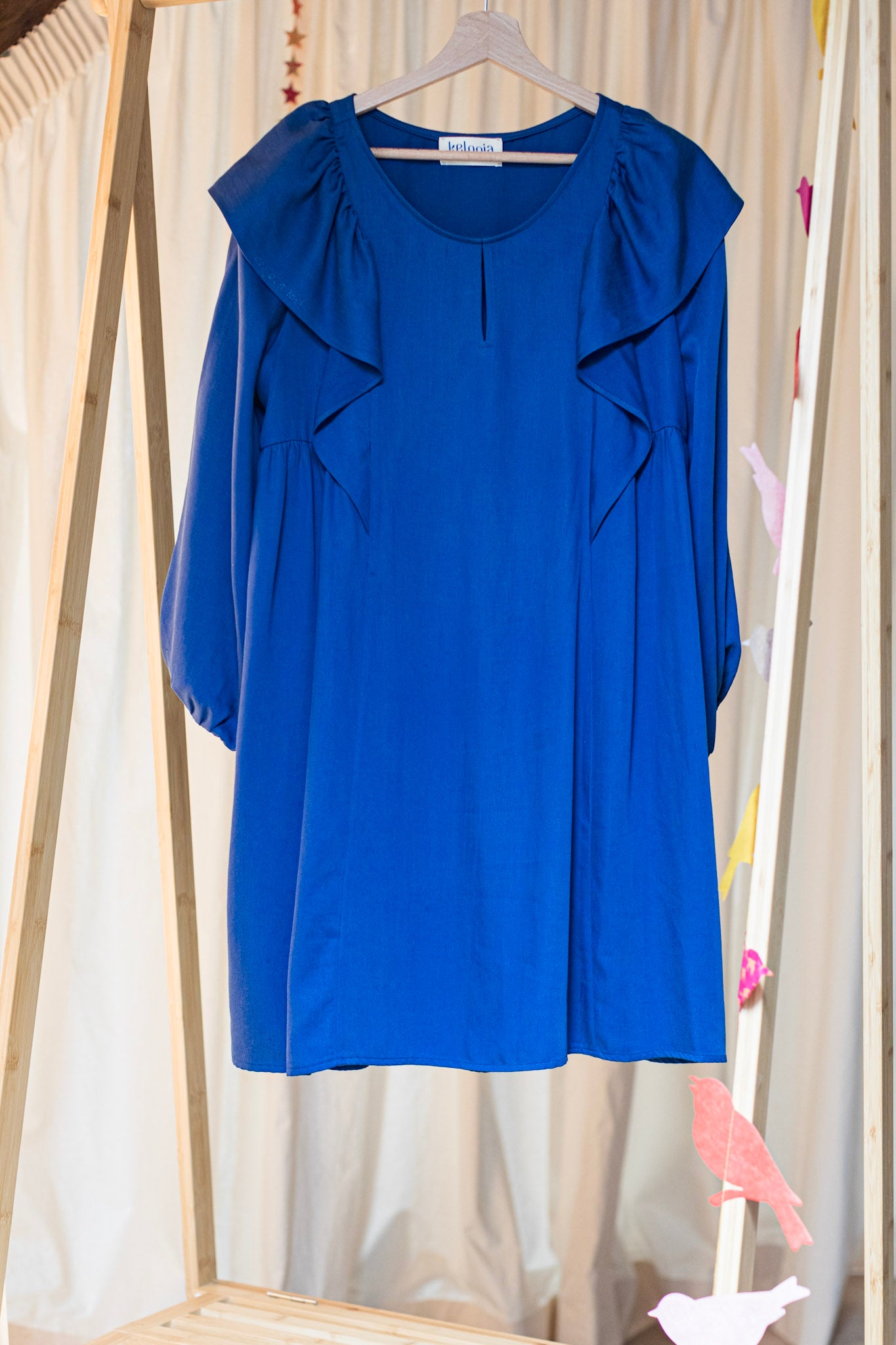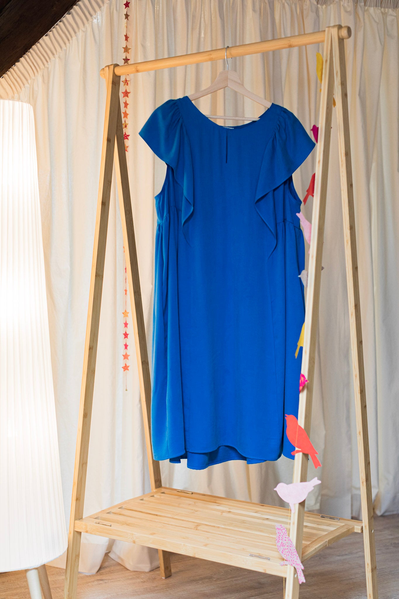 La robe Contemporaine est moderne et résolument féminine. Elle souligne délicatement la poitrine avant de s’évaser dans une coupe trapèze qui laisse libre la taille et les hanches. Son col tailleur inversé dessine un décolleté en V qui structure l’allure avec élégance. Ce que j’adore, ce sont ses volants légers sur les épaules, qui font office de manches courtes et ajoutent une touche de féminité à l’ensemble.